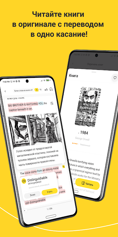রাশিয়ান ভাষায় পাঠ্যের অনলাইন অনুবাদ সহ ইংরেজিতে বই পড়া একটি বিদেশী ভাষা স্ব-শিক্ষার জন্য সবচেয়ে কার্যকর পদ্ধতিগুলির মধ্যে একটি। কোনো অপরিচিত শব্দ গেম টাস্ক ব্যবহার করে একটি ব্যক্তিগত মেমরি ব্লক যোগ করা যেতে পারে. .