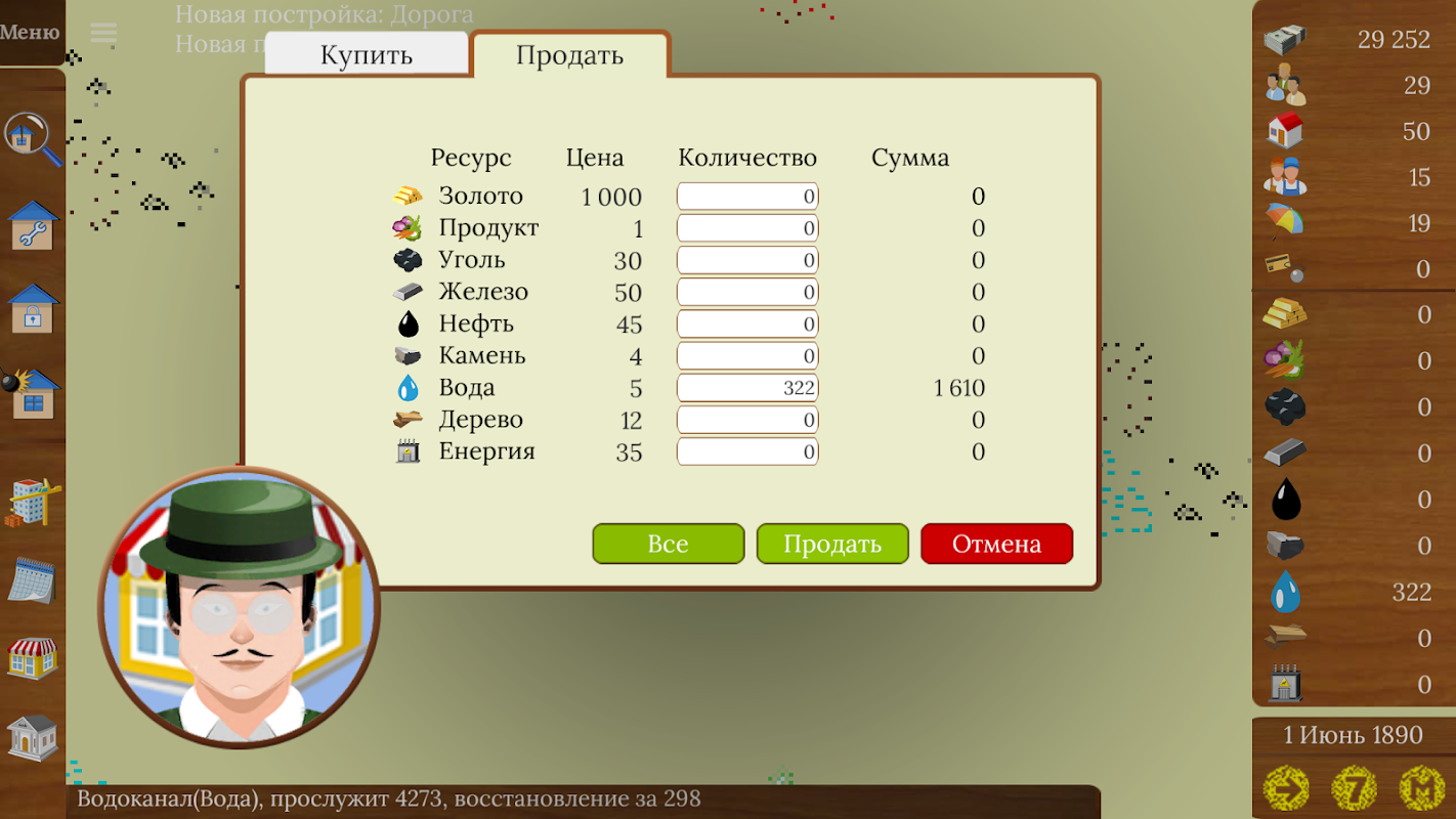 · Количество ваших денег и ресурсов отображается на экране справа, а сообщения - снизу.