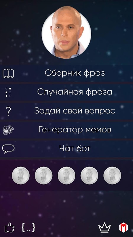 Коллекция ответов на все вопросы от Сергея Дружко. Сергей Дружко - лучшие фразы на каждый день. Топовый мем только для ценителей. Установи карманного искателя потустороннего и говори с ним на его языке. Отправляй друзъям в социальные сети и по почте комбинации из фраз или мемы. Поговори с ним через специальную опцию и он всегда поймет и поддержит тебя в трудную минуту!
