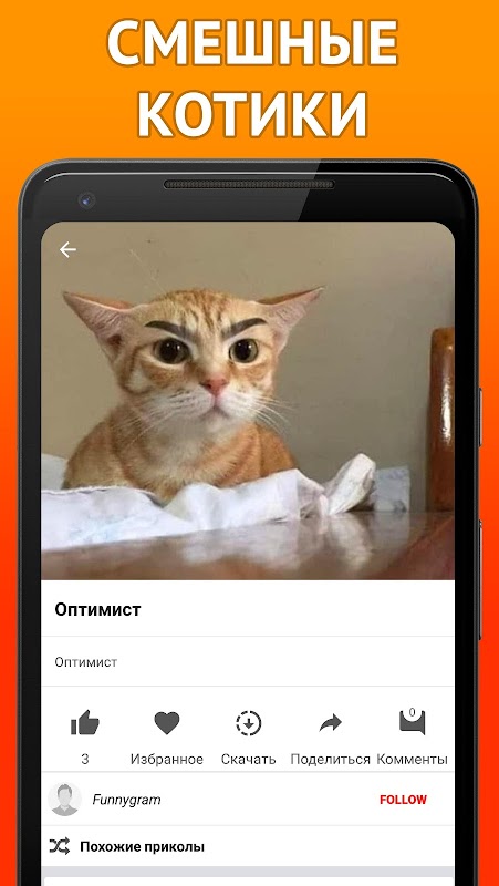 Делитесь наиболее понравившимися приколами вместе с друзьями через соцсети или мессенджеры. Если какой-либо пост понравился – ставьте лайки и оставляйте комментарии. Просто нажав на соответственную кнопку телефона, любая фотография, пост или анимация мгновенно скачается.