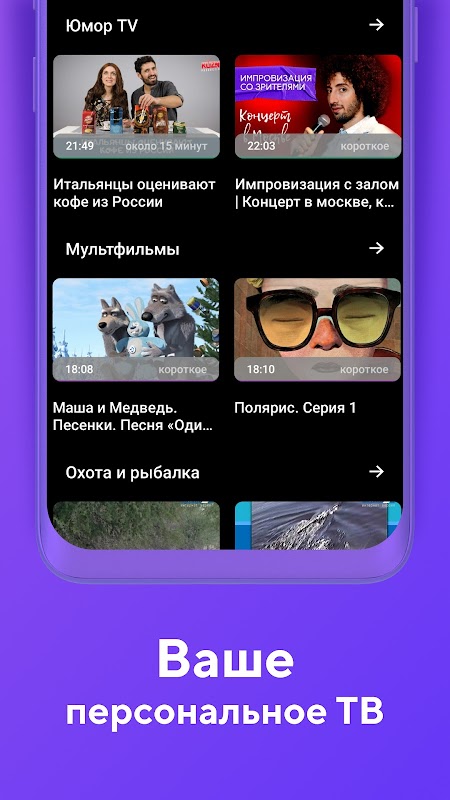 Смотрите новости утром, во время работы слушаете музыку для концентрации, а вечером пересматриваете любимые комедии? Алгоритм рекомендаций составит для вас персональный плейлист, который будет соответствовать вашим предпочтениям. Чтобы рекомендации были точнее — ставьте оценки трекам и видео, добавляйте в избранное любимые фильмы или новые сериалы, подписывайтесь на подборки с видео от любимых блогеров или блокируйте передачи, которые не хочется смотреть.