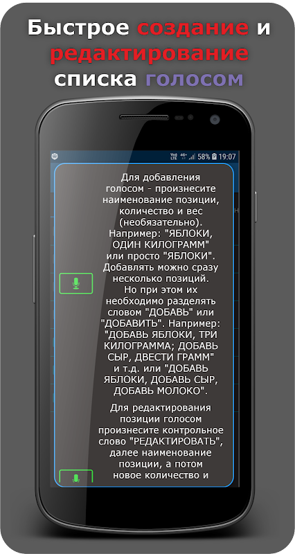 Оптимизируйте свой поход в магазин с приложением "Список покупок". Создавайте и храните необходимые списки покупок вручную или голосом, диктуя весь список без остановки. Делитесь списками покупок с родными, близкими и друзьями. Расшифруйте полученный текст и преобразуйте его в список покупок. Отмечайте в магазине приобретенную позицию, отслеживайте цены товаров, а также добавляйте и пользуйтесь скидочными картами не выходя из приложения. Удобное редактирование, в том числе и голосом, простой и понятный интерфейс. Удачи!