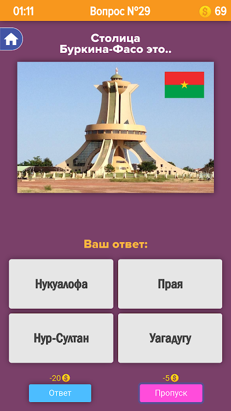 В этом приложении Вы сможете проверить и улучшить свои знания в области географии, а именно - столицы стран мира. Если Вы не знаете ответа на вопрос - его всегда можно пропустить кнопкой "Пропуск", а узнать правильный ответ при помощи кнопки "Ответ". За правильные ответы Вам будут начисляться поощрительные монетки, а за неверные - списываться. К пропущенным вопросам всегда можно будет вернуться позже.