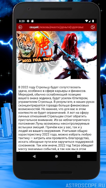 মোবাইল অ্যাপ্লিকেশনটিতে ধনু রাশির প্রতিনিধিদের জন্য একটি বার্ষিক জ্যোতিষশাস্ত্রের পূর্বাভাস রয়েছে: রাশিফল ২০২২। সম্মানিত জ্যোতিষীদের সুপারিশের জন্য ধন্যবাদ, ধনুদের অনুমান করতে হবে না যে ২০২২ সালে তাদের জীবনের কোন অঞ্চলে মনোযোগ দেওয়া উচিত।