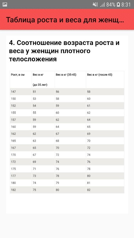মহিলাদের বয়স অনুসারে উচ্চতা এবং ওজনের অনুপাতের মানগুলির সারণী। রেফারেন্স বই