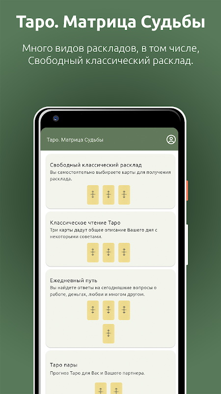 ট্যারোট অ্যাপ্লিকেশন আপনাকে ভবিষ্যতের ভবিষ্যদ্বাণী করার জন্য কার্ড লেআউট তৈরি করতে দেয়, সেইসাথে অতীত এবং বর্তমান বিশ্লেষণ করতে দেয়। ব্যবহারকারীরা এক, তিন, পাঁচ, সাত এবং আরও অনেক কিছু সহ বিভিন্ন ধরণের স্প্রেড এবং ব্যাখ্যা থেকে বেছে নিতে পারেন। কার্ডের পাশাপাশি অবস্থানের পদ্ধতি, অবস্থান এবং কার্ডের সংমিশ্রণ সহ ব্যাখ্যার বিভিন্ন পদ্ধতি।