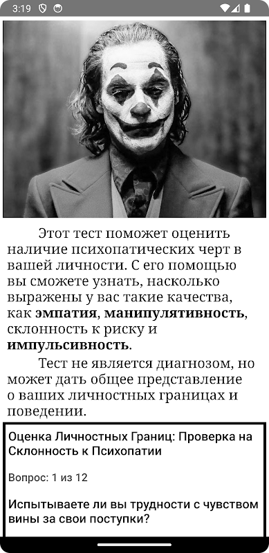 - **12-প্রশ্ন পরীক্ষা**: সাবধানে নির্বাচিত প্রশ্নের উত্তর দিন যা আপনার ব্যক্তিত্বের মূল সাইকোপ্যাথিক বৈশিষ্ট্য সনাক্ত করতে সাহায্য করবে। প্রতিটি প্রশ্নের লক্ষ্য আপনার আচরণ এবং চিন্তাভাবনার কিছু দিক বিশ্লেষণ করা।