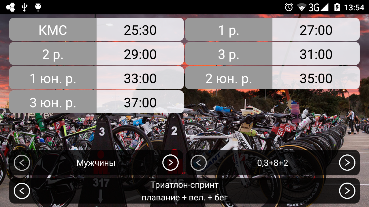 Если вы хотите знать с каким временем вам нужно завершить соревнование, чтобы получить спортивный разряд или спортивное звание по триатлону эта программа будет вам весьма кстати.