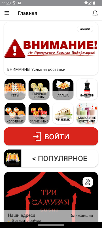 থ্রি সামুরাই রেস্তোরাঁর মোবাইল অ্যাপ্লিকেশনে, আপনি একটি অর্ডার দিতে পারেন। আপনার জন্য আমরা সুস্বাদু, স্বাদযুক্ত রোল, প্রতিটি স্বাদের জন্য সেট, নুডুলস, বার্গার, সালাদ, চিজকেক, গরম খাবার এবং পানীয় প্রস্তুত করি।