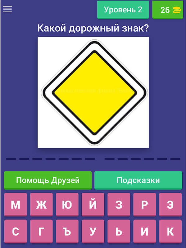 Правила как всегда мега простые: на каждом уровне вам показывается картинка на которой загадан дорожный знак. Он может быть любой из ПДД. Вам нужно из имеющихся букв подставить правильное слово и тем самым пройти уровень!
