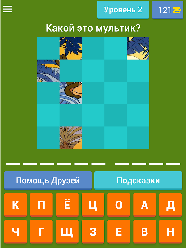 Изображение закрывают плитки, открыв часть картинки нужно догадаться как называется мультфильм или герой. (В зависимости от вопроса).