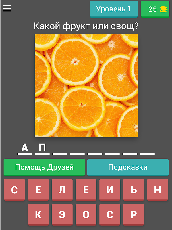 Правила как всегда мега простые: на каждом уровне вам показывается картинка на которой загадан очень знакомый продукт. Это может быть любой фрукт или овощ. Вам нужно из имеющихся букв подставить правильное слово и тем самым пройти уровень!