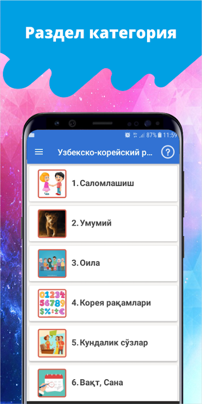 Русско- узбекский разговорник содержит более 2000 фраз, которые отсортированы и сгруппированы по темам с изображениями. Самое главное узбекско-корейский разговорник произношение фразы на корейском языке, это функция позволяет изучать корейский язык с правильным произношением.