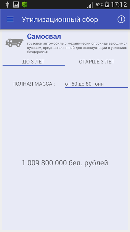 Приложение рассчитывает сумму утилизационного сбора за ввезенный в Республику Беларусь автомобильный транспорт в соответствии с действующими нормативными правовыми актами Республики Беларусь.