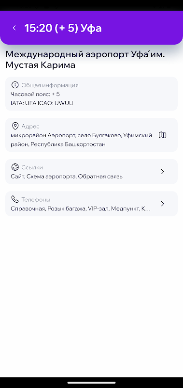 √ airportufa.ru/ ওয়েবসাইট থেকে তথ্য: ফ্লাইটের অবস্থা, প্রকৃত প্রস্থান বা আগমনের সময়, প্রস্থান নম্বর