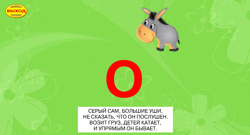বর্ণমালার প্রতিটি অক্ষর গবেষণা বর্ণের চাক্ষুষ ইমেজ শব্দ, সঞ্চয় এবং প্লেব্যাক উচ্চারণ সংশোধন করার জন্য একটি খেলা মোতায়েন ব্যায়াম সঙ্গে 18 পর্যায়ে গঠিত, অন্যান্যের মধ্যে যে চিঠি খোঁজার খসড়া এবং ভয়েস সিলাবল চিঠি অধ্যয়ন।