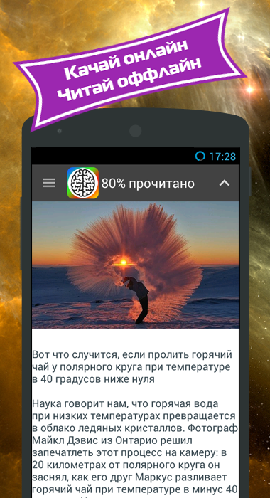 С помощью данного приложения ты можешь загрузить в свой телефон или планшет познавательные факты из лучших пабликов ВКонтакте и читать их в режиме оффлайн.