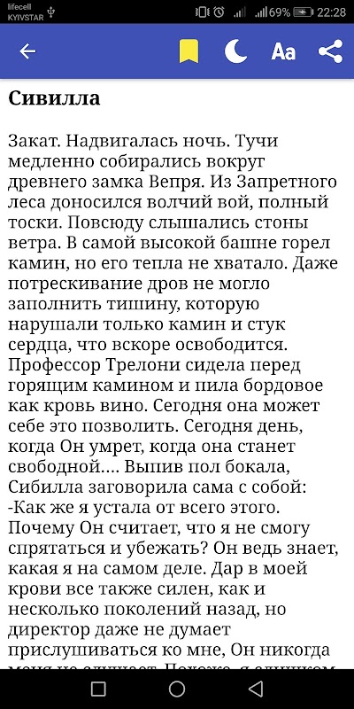 Приложение поддерживает ночной режим и оффлайн режим (без интернета), есть поиск. Понравившиеся "Хогвартские фанфики" можно добавить в избранное, а также поделиться с друзьями.