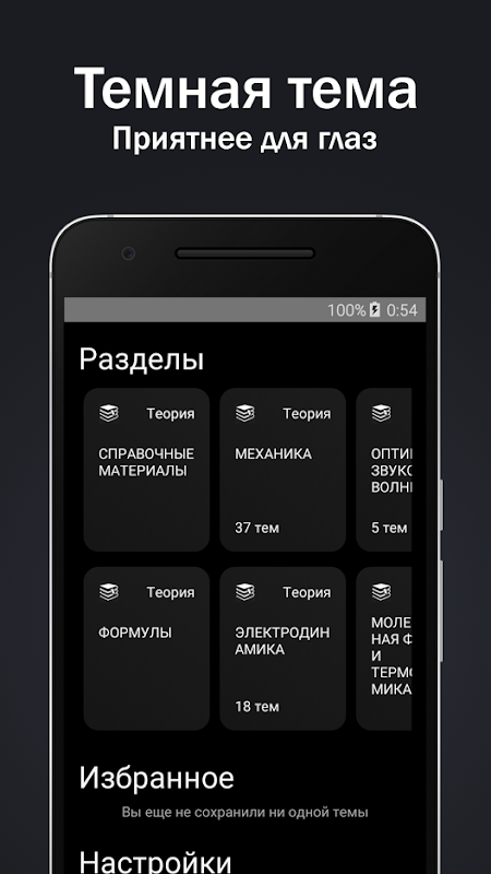 Легкий и удобный справочник по физике с темной темой поможет вам подготовиться к ЕГЭ и ОГЭ (ГИА), а также к другим экзаменам по физике. Содержит в себе большое количество шпаргалок, разбитых по темам: "Механика", "Молекулярная физика и термодинамика", "Электродинамика", а также "Оптика и звуковые волны".