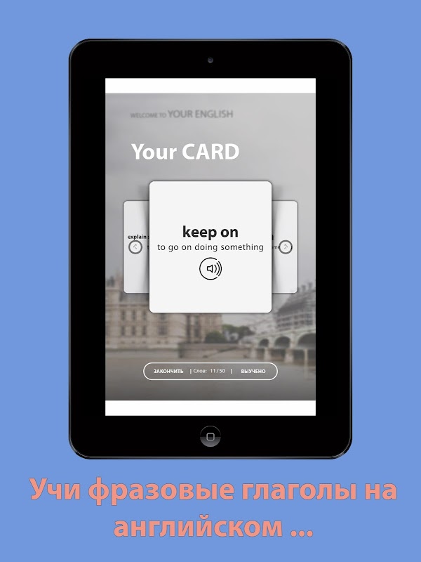 С помощью карточек Вы сможете, учить фразовые глаголы сразу на английском языке, если это сложно, можно перевернуть карточку и объяснение глагола будет уже на русском языке. Это дает возможность, в не зависимости от уровня английского, погрузиться в изучение языка.