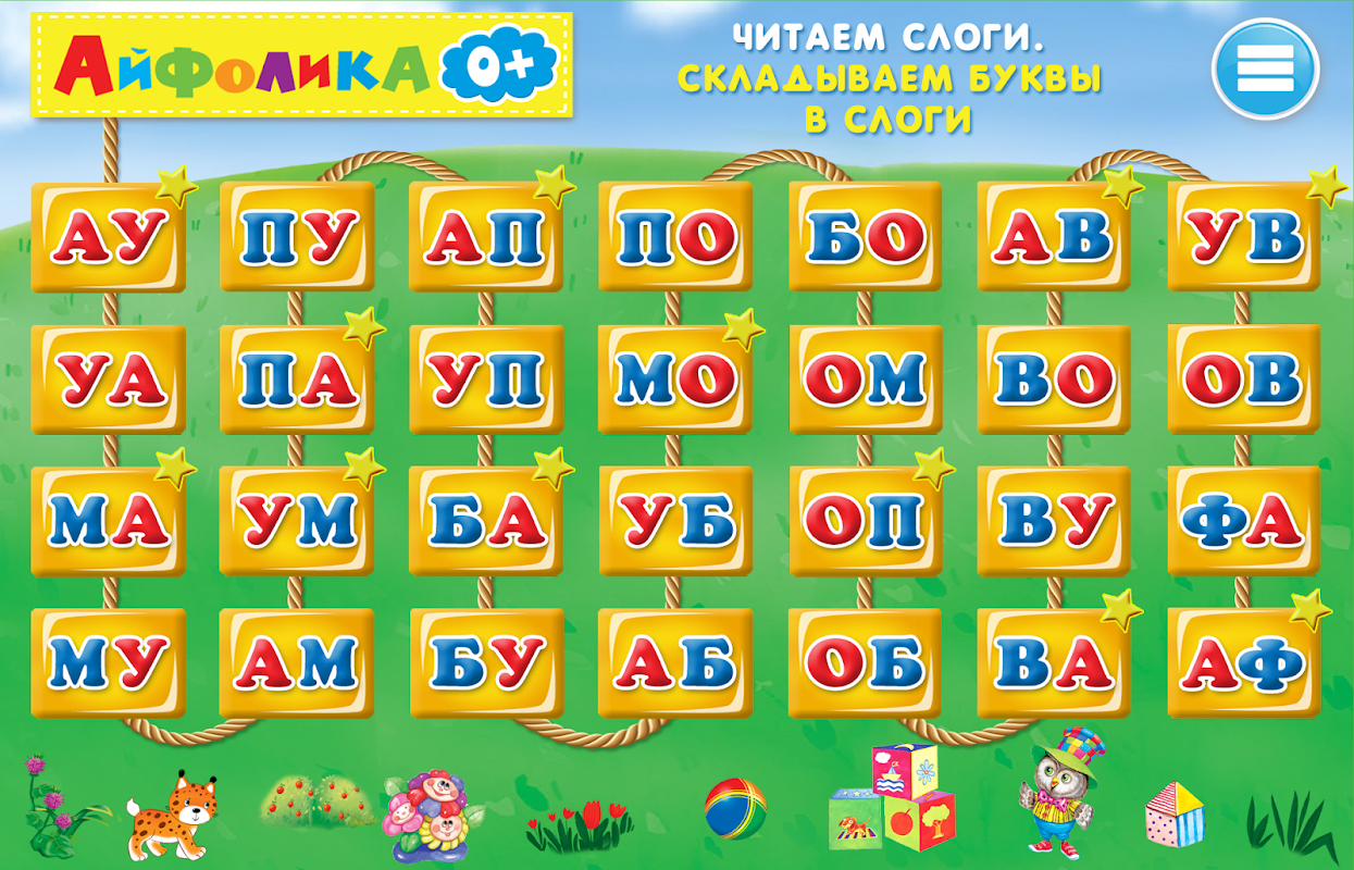 সিলাবল পড়তে শেখার জন্য আবেদন। শিশু দুই অক্ষরের খোলা এবং বন্ধ করা সিলাবল জমান দেওয়া হয়। এটিতে আঁকা অক্ষর সঙ্গে অ্যানিমেটেড আন্দোলন কিউব সাহায্য করে চিঠি দুটি পৃথক এবং নিলীন শব্দাংশ নয় উচ্চারণ শিশু শিখতে।