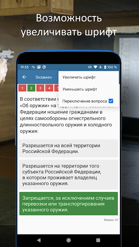 অস্ত্র BOO এর নিরাপদ পরিচালনার জন্য তাত্ত্বিক পরীক্ষায় উত্তীর্ণ হওয়ার প্রস্তুতির জন্য একটি কার্যকর আবেদন (হালনা করা আইন "অন ওয়েপন্স" (150-FZ) সহ)।