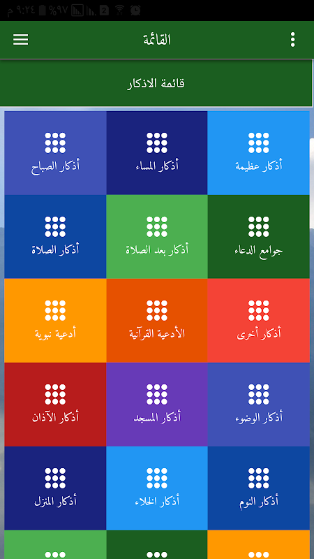 الأدعية والأذكار من القرآن والسنة التي يحتاجها المسلم في حياته اليومية أذكار الصباح,أذكار المساء,أذكار عظيمة,أذكار المنزل,أذكار الآذان,أذكار المسجد,أذكار الخلاء,أذكار التشهد,أذكار الصلاة,أذكار الوضوء,أذكار النوم,أذكار الاستيقاظ,أذكار الطعام ,أذكار أخرى,أدعية القرآن الكريم,دعاء ختم القرآن الكريم.