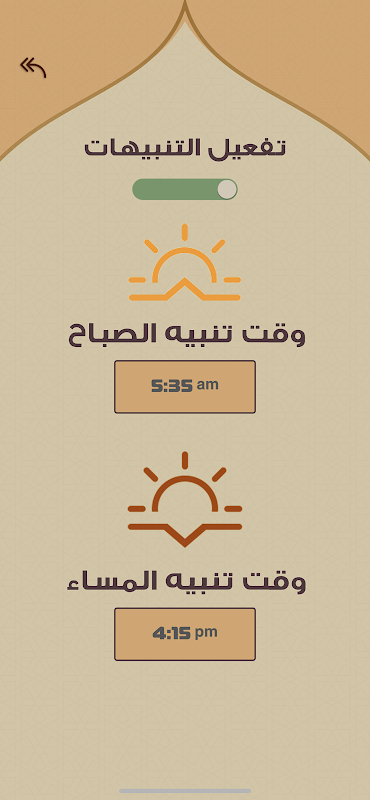 প্রধান মেনু থেকে, আপনি বিজ্ঞপ্তি স্ক্রীনে প্রবেশ করতে পারেন, যা আপনাকে বিজ্ঞপ্তিগুলি সক্রিয় করতে সক্ষম করে যাতে আপনি সকাল এবং সন্ধ্যার স্মৃতি পড়ার জন্য একটি অনুস্মারক পেতে চান এমন সময় বেছে নিতে পারেন।