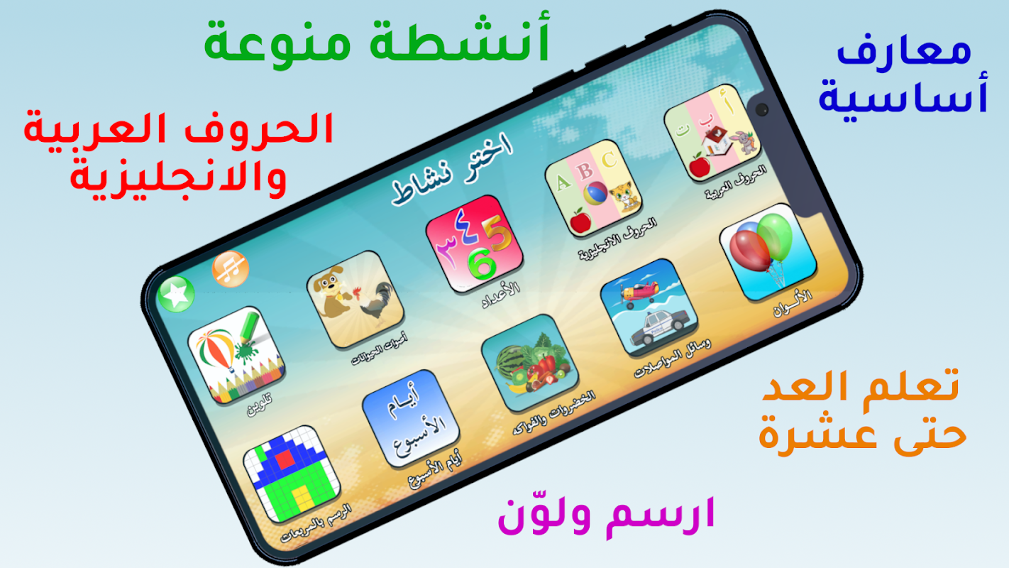 শিশুদের জন্য আরবি অক্ষর শেখানোর আবেদনে আমরা আপনাকে এটি অফার করতে পেরে আনন্দিত, কারণ এতে সমস্ত আরবি অক্ষর রয়েছে, অর্থাত্ শব্দ ছাড়াও A থেকে Z পর্যন্ত বর্ণমালা, পাশাপাশি সংখ্যা শেখানো, রঙ শেখানো, শাকসবজি এবং ফল শেখানো , প্রাণীদের শিক্ষাদান এবং অনেক কার্যক্রম। অ্যাপ্লিকেশনটি শিশুদের অক্ষর এবং শব্দ শেখানোর সরলীকৃত পদ্ধতি দ্বারা চিহ্নিত করা হয়, এইভাবে শিশুদের পড়তে শেখানো হয়।