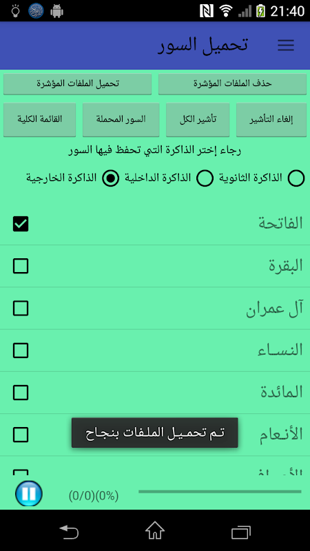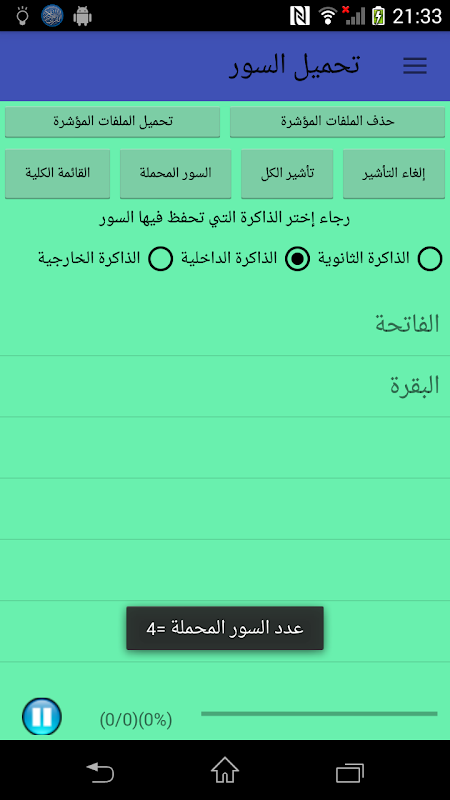 تطبيق الاستماع للقرآن الكريم كاملا بصوت الشيخ محمد مقاتلي الابراهيمي برواية ورش عن نافع حيث يمكنك الاستماع من النت أو تحميل السور والاستماع لها بدون أنترنت ، ننصحك بتحميل السور الى الذاكرة الخارجية ، لأن الذاكرة الداخلية محدودة وصغيرة ، ولتحميل الملفات يجب عليك تأشيرها وإختيار مكان الحفظ ، كما يمكنك حذف الملفات إذا إمتلأت الذاكرة .