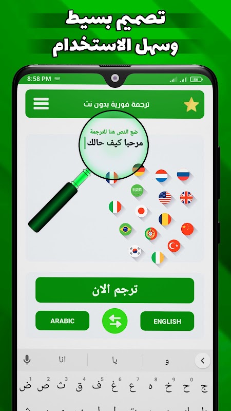 নেট ছাড়াই একটি যুগপৎ অনুবাদ অ্যাপ্লিকেশন যা আপনাকে অ্যান্ড্রয়েড ডিভাইসে ইন্টারনেট ছাড়াই ইংরেজি থেকে আরবিতে অনুবাদ করার এবং লেখার মাধ্যমে ইংরেজি থেকে আরবিতে অনুবাদ করার ক্ষেত্রে দ্রুত এবং সরলীকৃত অভিজ্ঞতা লাভ করতে সক্ষম করে।