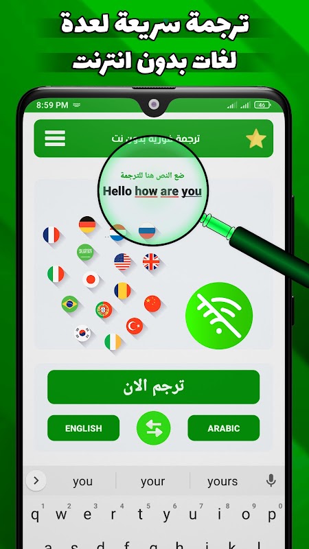 নেট ছাড়াই একটি যুগপৎ অনুবাদ অ্যাপ্লিকেশন যার মাধ্যমে আপনি শব্দ, বাক্যাংশ এবং বাক্যকে একটি সহজ এবং সহজ উপায়ে অনুবাদ করতে পারেন এবং ইন্টারনেট ছাড়াও, আপনি আরবি থেকে ইংরেজি বা আরবি থেকে হিন্দিতে বা রাশিয়ান থেকে ইংরেজি বা আরবি থেকে ইংরেজিতে অনুবাদ করতে পারেন অথবা প্রায় ইন্টারনেট ছাড়াই বিশ্বের বিভিন্ন ভাষায় অনুবাদ করুন এবং তদ্বিপরীতও ইংরেজি থেকে আরবি থেকে দ্রুত এবং পেশাদারভাবে অনুবাদ করুন।