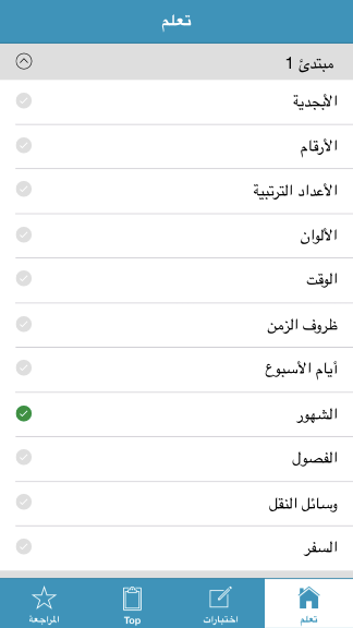 تطبيق اللغة الانجليزية يتكون من أقسام مختلفة.الأقسام من بسيطة إلى معقدة.