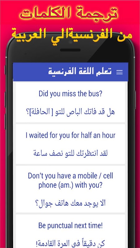 ادا كنت تواجه مشاكل في تعلم اللغة الفرنسية بدون انترنت فمن خلال هدا التطبيق ستتمكن من تعلم الفرنسية من الصفر حتى الاحتراف بشكل سهل وسلس من خلال تعلم مجموعة من الكلمات والجمل التي نستخدمها في حياتنا اليومية.