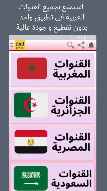 مع تطبيق تلفاز بدون تقطيع شاهد جميع القنوات يمكنك مشاهدة جميع القنوات العربية بكل بساطة و سهولة ، احدث القنوات و البرامج الرمضانية على تطبيق تلفاز بدون تقطيع ، تلفاز بدون تقطيع جميع قنوات العالم العربي. يتضمن التطبيق تلفاز بدون تقطيع جميع القنوات المغربية و الجزائرية ، بالاضافة للتلفزة المصرية و السعودية و تلفاز الامارات مباشرة مجانا .