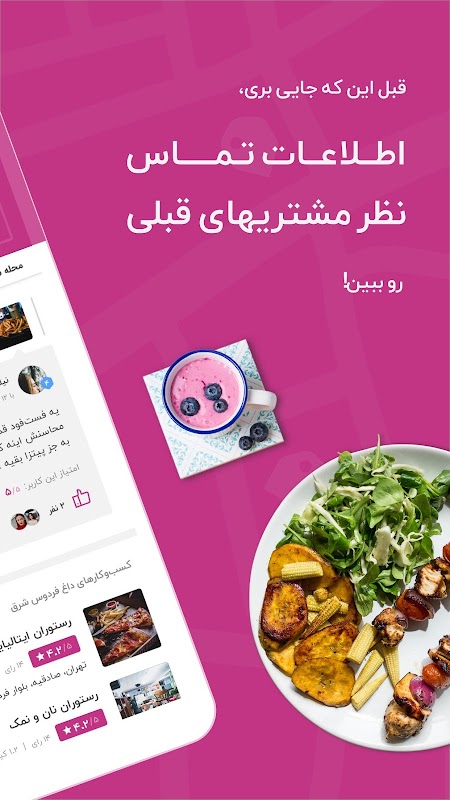✔️ با دیدن نظرها و عکسهایی که مشتریهای قبلی گذاشتن و آیتمهای منوی رستوران، بدونید چه چیزی انتظارتون رو میکشه و درستترین تصمیم رو بگیرید.