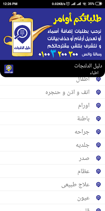 تطبيق أبليكشن دليل الدلنجات "بلدك في تليفونك" مساحته صغيرة يعمل بدون نت به جميع التليفونات مقسمة حسب المهن وسهل التحميل والبحث والاتصال والمشاركة ويوجد بعض التفاصيل كالعنوان ورابط الفيس وبالدليل منيو المطاعم والأخبار الهامة والعروض و نرحب بالمقترحات ويتم التحديث باستمرار ارسل اسمك ورقمك ومجالك ليضافوا واتس 01003200300 كما يمكنكم أيضاً تحميل ( دليل كوم حماده - دليل ايتاى - دليل شبراخيت ) وذلك بالبحث عنهم فى متجر جوجل بلاى - قيمنا 5 نجوم بالمتجر وشارك الدليل لتعم الفائدة
