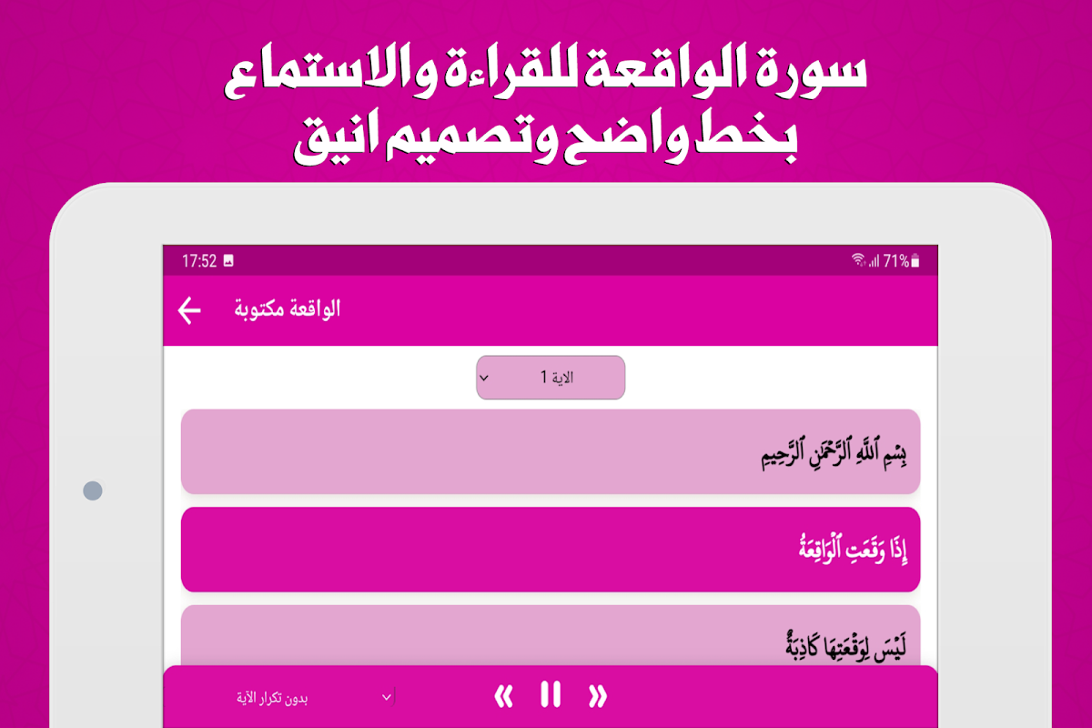 প্রোগ্রামটিতে সুরাত আল-ওয়াকিয়াহ লিখিত এবং অডিও রয়েছে এবং এটি নেট ছাড়া কাজ করে, সবচেয়ে চমৎকার আরব পাঠকদের কণ্ঠে।