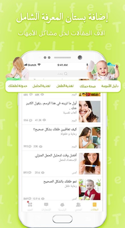 আমার শিশু লাইভ আরব মা অ্যাপ্লিকেশন নং 1, যেমন এতে মা এবং গর্ভবতী মহিলার প্রয়োজনীয় সমস্ত সরঞ্জাম এবং তথ্য রয়েছে, পাশাপাশি শিশু যত্ন, শিশুর বিকাশ, গর্ভাবস্থা স্বাস্থ্য এবং ভ্রূণ সম্পর্কিত সমস্ত বিষয়ে মায়েদের মধ্যে অভিজ্ঞতা বিনিময় করার জন্য একটি নিরাপদ সম্প্রদায় রয়েছে। শিশুর ট্র্যাকার এবং ভ্রূণের বিকাশ, গর্ভাবস্থার পরিবর্তন, গর্ভাবস্থা ক্যালকুলেটর, প্রসবকালীন, শিশুদের প্রেসক্রিপশন, শিশুর সংগীত এবং আরও অনেক গুরুত্বপূর্ণ সরঞ্জামগুলি! শিশু এবং মায়ের জন্য দৈনিক নিবন্ধগুলি, যেমন গর্ভাবস্থার লক্ষণ, গর্ভাবস্থার লক্ষণ, নিকট জন্মের লক্ষণ, বৈবাহিক সম্পর্ক, স্তন্যপান করানো এবং শিল্প, তাদের গুরুত্ব এবং বাচ্চাদের উত্থাপন এবং মা এবং সন্তানের সাথে সম্পর্কিত অন্যান্য বিষয়। এই তথ্য ব্যবহারকারীর ধরণ দ্বারা সরবরাহ করা হয়। যদি কোনও গর্ভবতী মহিলা গর্ভবতী হন তবে গর্ভবতী-সম্পর্কিত নিবন্ধগুলির একটি দৈনিক সংগ্রহ, একটি অ্যাকাউন্ট, কীভাবে নিজের যত্ন নেবেন, ভ্রূণ ইত্যাদি তার প্রতিদিন প্রেরণ করা হয় এবং মহিলা কর্মচারীর যদি সন্তান থাকে তবে শিশু যত্ন, লালন-পালনের এবং খাওয়ানো সম্পর্কিত নিবন্ধগুলি প্রেরণ করা হয়।