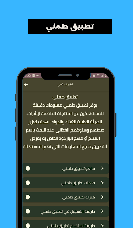 يوفر تطبيق طمني معلومات دقيقة للمستهلكين عن المنتجات الخاضعة لإشراف الهيئة العامة للغذاء والدواء؛ بهدف تعزيز صحتهم وسلوكهم الغذائي. عند البحث باسم المنتج أو مسح الباركود الخاص به يعرض التطبيق جميع المعلومات التي تهم المستهلك