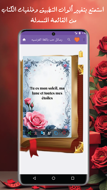 একটি মার্জিত ডিজাইনের সাথে রোমান্টিক বইয়ের পরিবেশের অভিজ্ঞতা নিন যা বাস্তব বইয়ের অনুকরণ করে। প্রতিটি উদ্ধৃতি একটি মার্জিত, ফ্লিপযোগ্য পৃষ্ঠায় প্রদর্শিত হয়, যেন আপনি একটি সুন্দর নকশা এবং একটি উষ্ণ, রোমান্টিক পরিবেশ সহ আপনার নিজের প্রেমের উপন্যাসটি পড়ছেন। সবচেয়ে ভালো দিক হল আপনি ছবিটি ডাউনলোড এবং শেয়ার করতে পারেন রোমান্টিক উপায়ে।