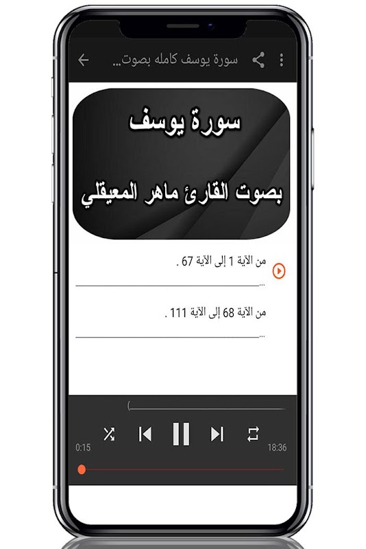 يحتوي تطبيق " ماهر المعيقلي سورة يوسف بدون نت " على تلاوة خاشعة لسورة يوسف بصوت الشيخ ماهر المعيقلي بدون نت.