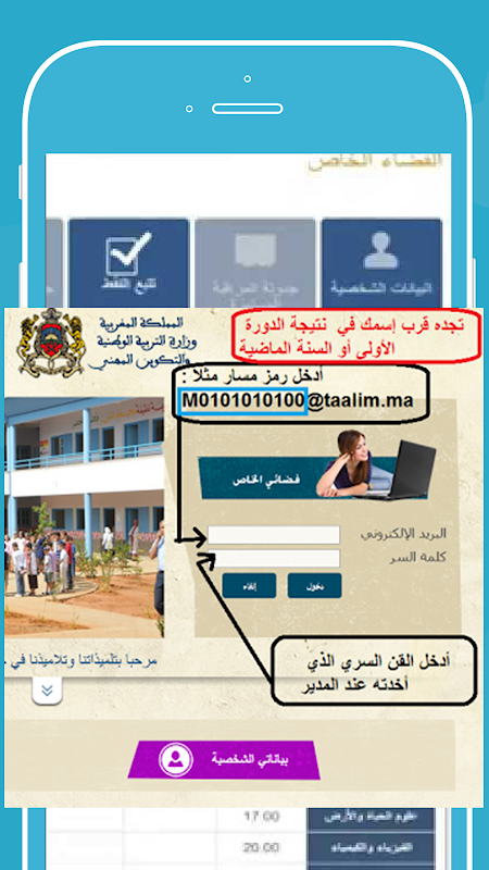 تطبيق موقع مسار و موقع المتمدرس هو عبارة عن بوابة خاصة بتلميذات وتلاميذ التعليم الثانوي التأهيلي و الابتدائي والثانوي الإعدادي يسهل لهم الاطلاع على نقطهم و يحتوي نتائج البكالوريا أيضا .