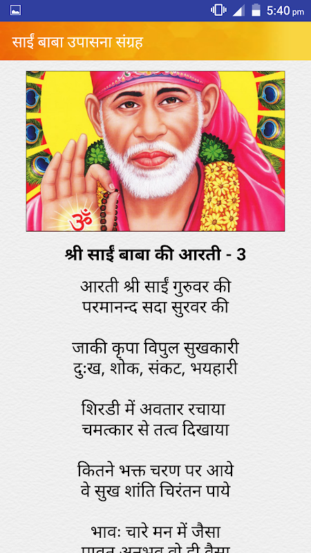 এটি একটি বিনামূল্যে অ্যান্ড্রয়েড অ্যাপ্লিকেশন যা শ্রী শিরদী সাঁইবাবা আরতি চালিশা মন্ত্র পূজা বিধি সাঁই স্মরণ এবং বান্দনার সম্পূর্ণ তথ্য ধারণ করে। সাঁইবাবা ছিলেন একজন ভারতীয় আধ্যাত্মিক গুরু, যিনি তাঁর ভক্তরা তাঁকে সন্ত, একজন ফকির, একজন সতীগুরু এবং ভগবান শিবের অবতার (অবতার) হিসাবে গণ্য করেছিলেন এবং একজন অন্যতম পূজিত প্রভু।