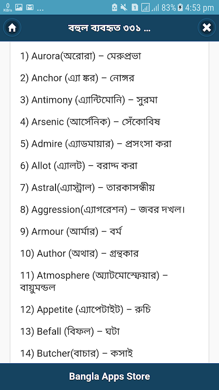 You can say this is english to bangla word book as well. We cover most important words to this english to bangla word book . English vocabulary is most important part of learning english to bangla . if your english vocabulary is strong then learning english to bangla is became easy for you. You understand every english to bangla word then you can speak very well. So try to enlarge your english to bangla word as much as possible. Understand more and more english to bangla word mining you are ready to go. When English to bangla word mining stored in your memory you have the confidence of spoken english to bangla . After this you need to know english grammar . because without english grammar you can’t make sentence . You can also take help from bangla to english dictionary . bangla to english dictionary will help to find out word meaning quickly . there are lots of english to bangla dictionary apps in store . For searching words you need this english to bangla dictionary offline . Hope this english word pronunciation app help you a lot . hope that english word pronunciation app fulfills your desire need about bangla spoken english .