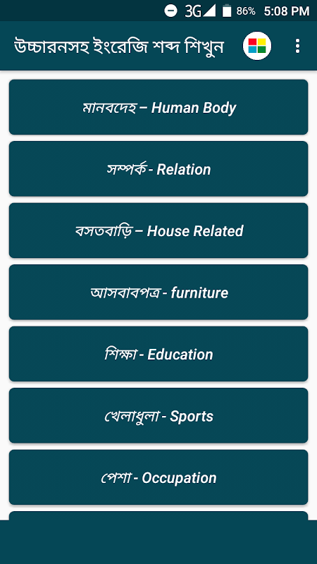 who wants to learn english word in Bangla then he see this application for word book english to bangla is a offline english to bangla vocabulary for them This type of offline english to bangla dictionary application . It also helps to translate any word into english to bangla or bangla to english. In this application we organize many words with pronunciation and bangla meaning.