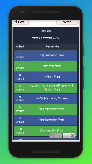 বছরের কোন তারিখে কোন দিবস এ নিয়ে আমাদের এবারের আয়োজন কোন দিন কি দিবস অ্যাপসটি। ইংরেজী বছরের ১২ মাসের প্রায় প্রতিটি দিনই কোন না কোন বিশেষ ঘটনাকে কেন্দ্র করে কোন না কোন বিশেষ দিবস হিসেবে পালিত হয় । বিভিন্ন দিবসে আমাদের দেশে সরকারী ছুটি ( ২০২০ সালের সরকারি ছুটির তালিকা) পালন করা হয়ে থাকে। বাংলা মাসের কোন মাসে কোন দিবস তাও আমাদের প্রায় সকলের অজানা। হাতে গণা দুই একটা দিন বা দিবস ছাড়া অধিকাংশ দিবসই আমাদের নখদর্পনে নয়। আমরা তাই এই অ্যাপসটি বাংলা মাসের দিবস , ছুটির দিন বাংলা ক্যালেন্ডার অনু্যায়ী , ইংরেজী মাসের দিবস এবং সে অনুযায়ী সরকারী ছুটির দিন গুলো ধারাবাহিকভাবে সাজিয়েছি একদম ক্যালেন্ডার এর মত করেই। এতে করে একই সাথে আপনারা একই সাথে দেশীয় ও আন্তর্জাতিক প্রতিদিনের দিবস সম্পর্কে খুব সহজেই অবহিত হতে পারবেন।দিবস সমূহ জানা থাকলে আমরা ছুটি কাটানোর জন্য সুন্দর পরিকল্পনা করতে পারবো। আমরা শুধু বাংলাদেশ সরকার ঘোষিত জাতীয় দিবস সমূহ যথাঃ- শহীদ দিবস, স্বাধীনতা দিবস, জাতীয় শোক দিবস, সশস্র বাহিনী দিবস, শহীদ বুদ্ধিজীবি দিবস, বিজয় দিবস এবং বাংলাদেশ সরকার অঘোষিত জাতীয় দিবস সমূহ যথাঃ- বঙ্গবন্ধু প্রত্যাবর্তন দিবস, সলঙ্গা দিবস, জনসংখ্যা দিবস, আগরতলা ষড়যন্ত্র মামলা প্রত্যাহার দিবস, ডায়াবেটিক দিবস, রাষ্ট্রভাষা দিবস, কালো রাত দিবস, খাপড়া ওয়ার্ড দিবস, নিরাপদ মাতৃত্ব দিবস , ছয়দফা দিবস, পলাশী দিবস, জাতীয় দিবস ও সংহতি দিবস, বঙ্গভঙ্গ দিবস, স্বৈরচার পতন দিবস, নিরাপদ সড়ক দিবস এই কয়েকটি দিবস সম্পর্কে জানি । এছাড়া ও আরো অনেক দিবস রয়েছে জাতীয় ও আন্তর্জাতিক । যা জানতে সহায়ক হবে আমাদের এই অ্যাপসটি।