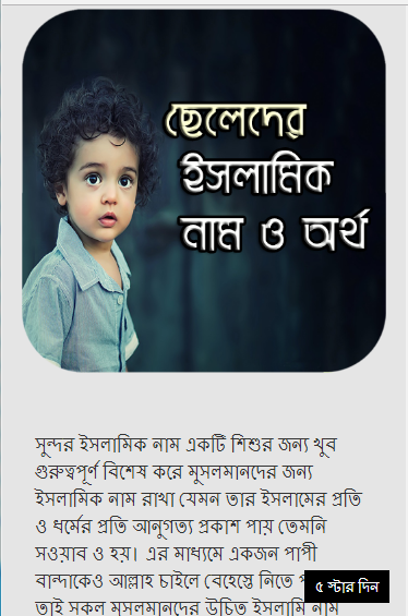 সুন্দর ইসলামিক নাম একটি শিশুর জন্য খুব গুরুত্বপূর্ণ বিশেষ করে মুসলমানদের জন্য ইসলামিক নাম রাখা যেমন তার ইসলামের প্রতি ও ধর্মের প্রতি আনুগত্য প্রকাশ পায় তেমনি সওয়াব ও হয়। এর মাধ্যমে একজন পাপী বান্দাকেও আল্লাহ চাইলে বেহেস্তে নিতে পারেন। তাই সকল মুসলমানদের উচিত ইসলামি নাম রাখা। আজ আমরা আপনাদের জন্য ছেলেদের ইসলামিক নাম ও অর্থ এই অ্যাপটি নিয়ে হাজির হয়েছি। এই অ্যাপটিতে আপনারা ছেলেদের (chaleder name) কিছু ইসলামিক অতিব সুন্দর নাম অর্থসহ পাবেন। শুরুতেই ছেলেদের সুন্দর ইসলামিক নাম (Cheleder islamic name) নিয়ে কিছু কথা বলা যাক। নির্দিষ্ট একটি নাম হল মানুষকে প্রাথমিকভাবে চেনার প্রথম উপায়। নামের ব্যাপারে বিশিষ্ট ব্যক্তিগন বলেছেন নাম আর কিছুই নয় কেবল একটি শব্দ। যা দিয়ে বোঝা যায় বহুর মধ্যে একজন আরেকজনকে আহব্বান করছে। নাম মানুষকে বিখ্যাত করেনা বরং মানুষ বিখ্যাত হলেই তার নাম সর্বত্র ছড়িয়ে পড়ে।