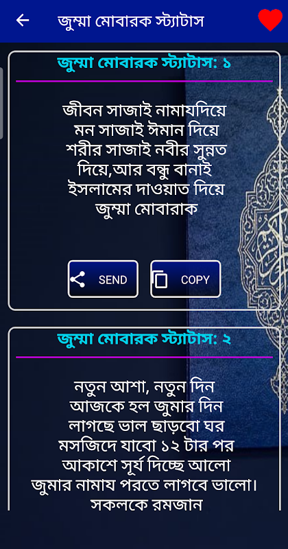 জুম্মা মোবারক স্ট্যাটাস সহ ইসলামিক ছোট ছোট উক্তি নিয়ে অ্যাপটি সাজানো হয়েছে ।