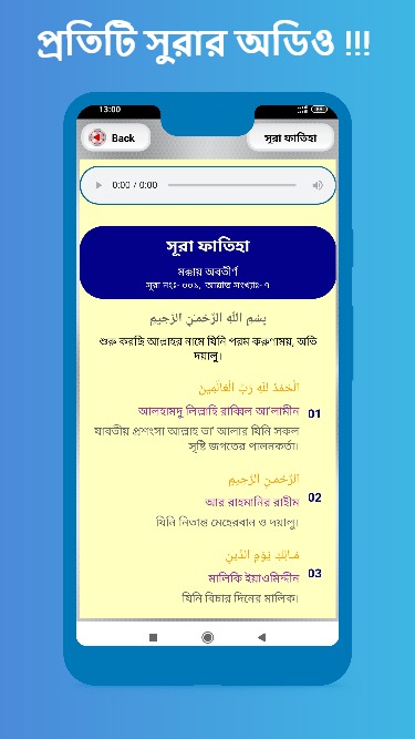 নামাজের সুরা সমুহ আমাদের এই অ্যাপ্লিকেশনটি কিছু নামাজের ছোট সূর্য অডিও সহকারে উপস্থিত হয়েছে। এই সূরা বোর অডিও এর বাংলা ইংরাজী আউটচারন এবং বাংলা অর্থ যোগ করা হয়েছে।